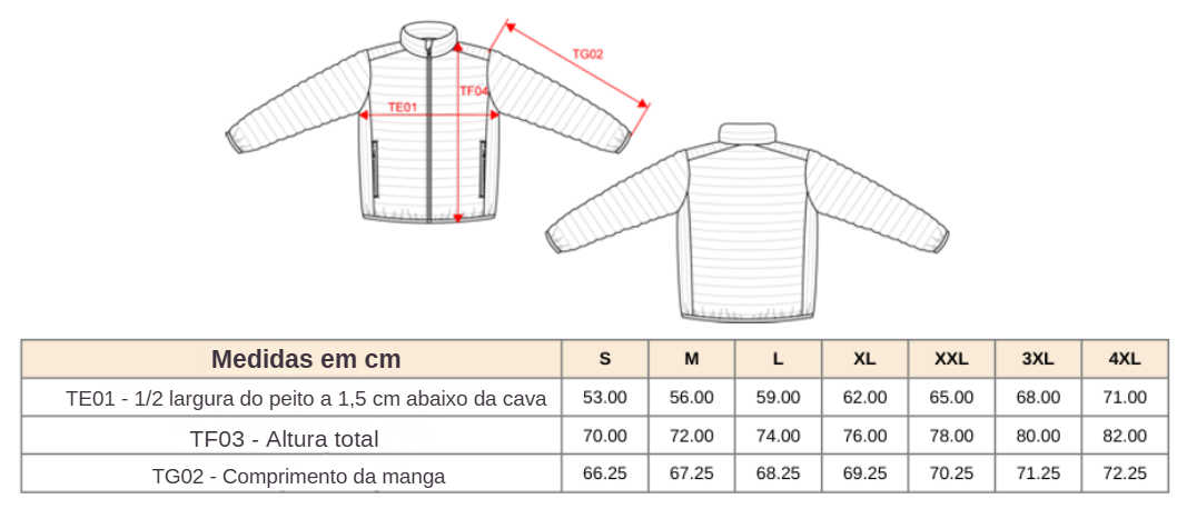Tabela de tamanhos: