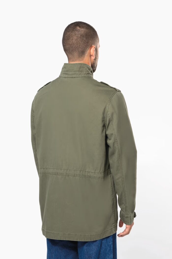 Fabricado com materiais resistentes e de alta qualidade, apresenta um corte direito e detalhes práticos como quatro bolsos frontais com pala, fecho frontal com botões, e gola estruturada. O design é pensado para proporcionar liberdade de movimentos, sem comprometer o estilo.