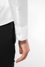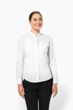 Camisa profissional para o setor da restauração, com gola mao (colarinho tipo padre) que confere um estilo moderno e elegante. Confeccionada em popeline de 65% poliéster e 35% algodão, com tratamento Easy Care para facilitar a manutenção e o engomar. Apresenta corte cintado, botões à cor, bolso no peito esquerdo com acabamento em V, punhos ajustáveis e bainha arredondada. Inclui botão extra.