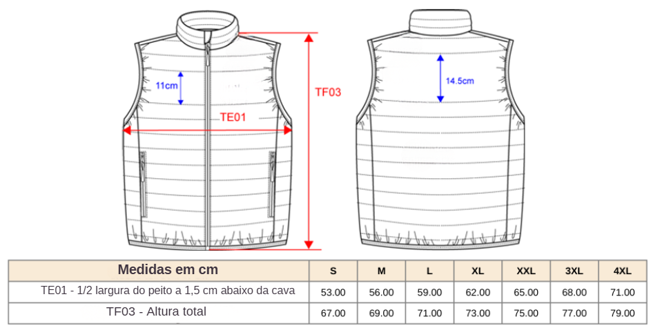 O acolchoamento horizontal, com faixa mais larga de 11 cm à frente e 14,5 cm nas costas, facilita a personalização. Acabamento elástico nas mangas e no cós, presilha para pendurar no interior da gola e saco de arrumação incluído tornam o colete prático para transportar e guardar.