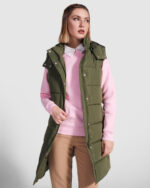 Colete acolchoado de senhora com capuz amovível. Gola alta, fecho de correr à frente oculto por uma aba. Dois bolsos com fecho de botão de pressão. Aberturas laterais com fechos de correr.