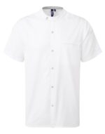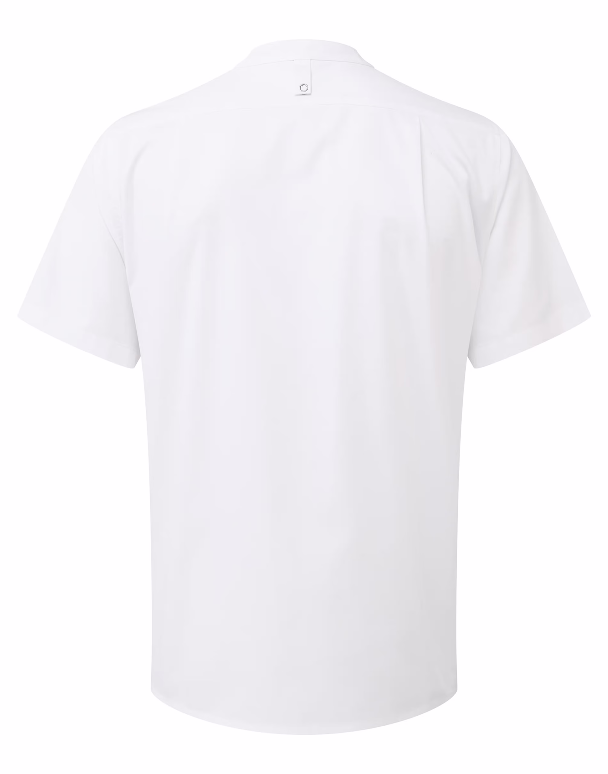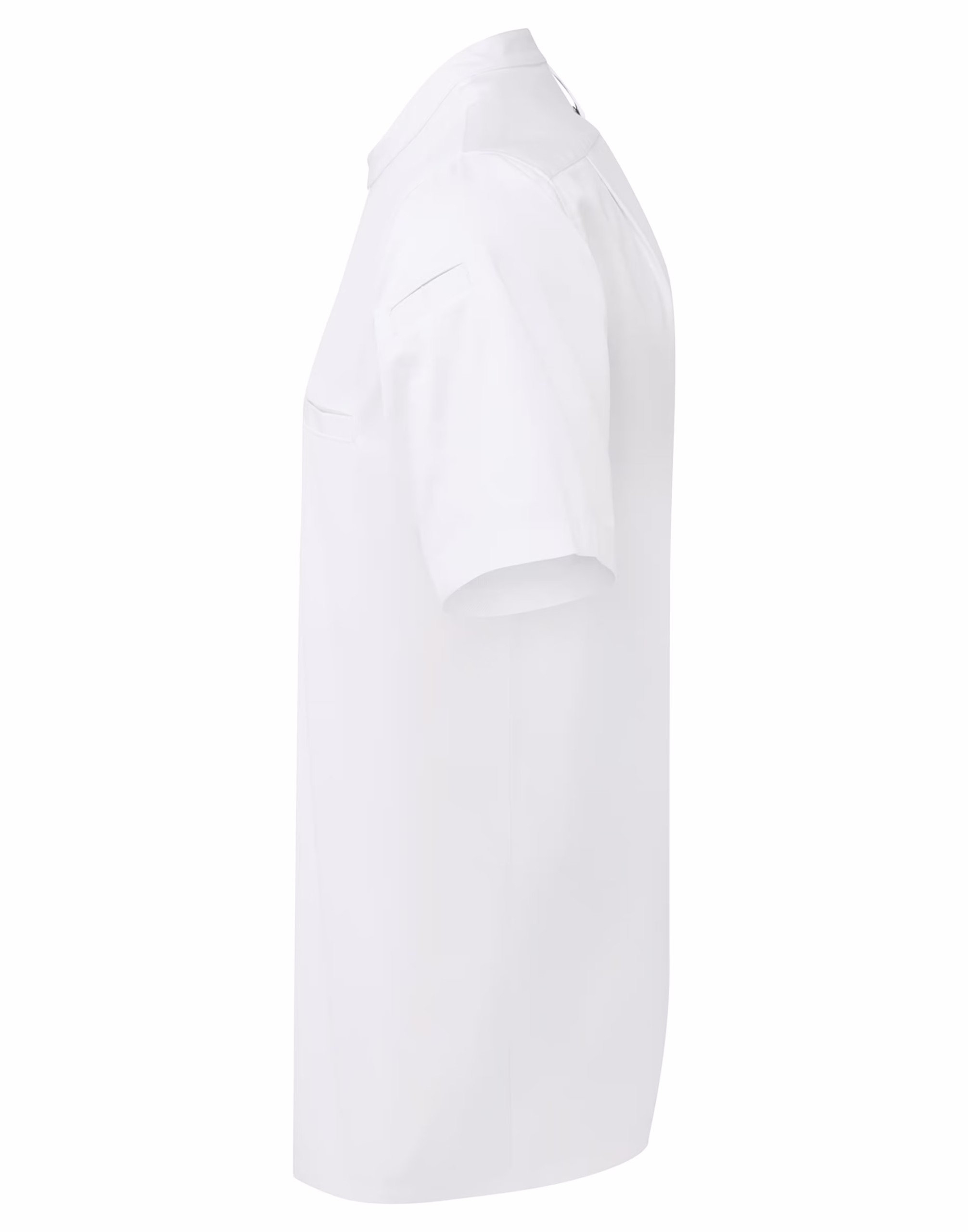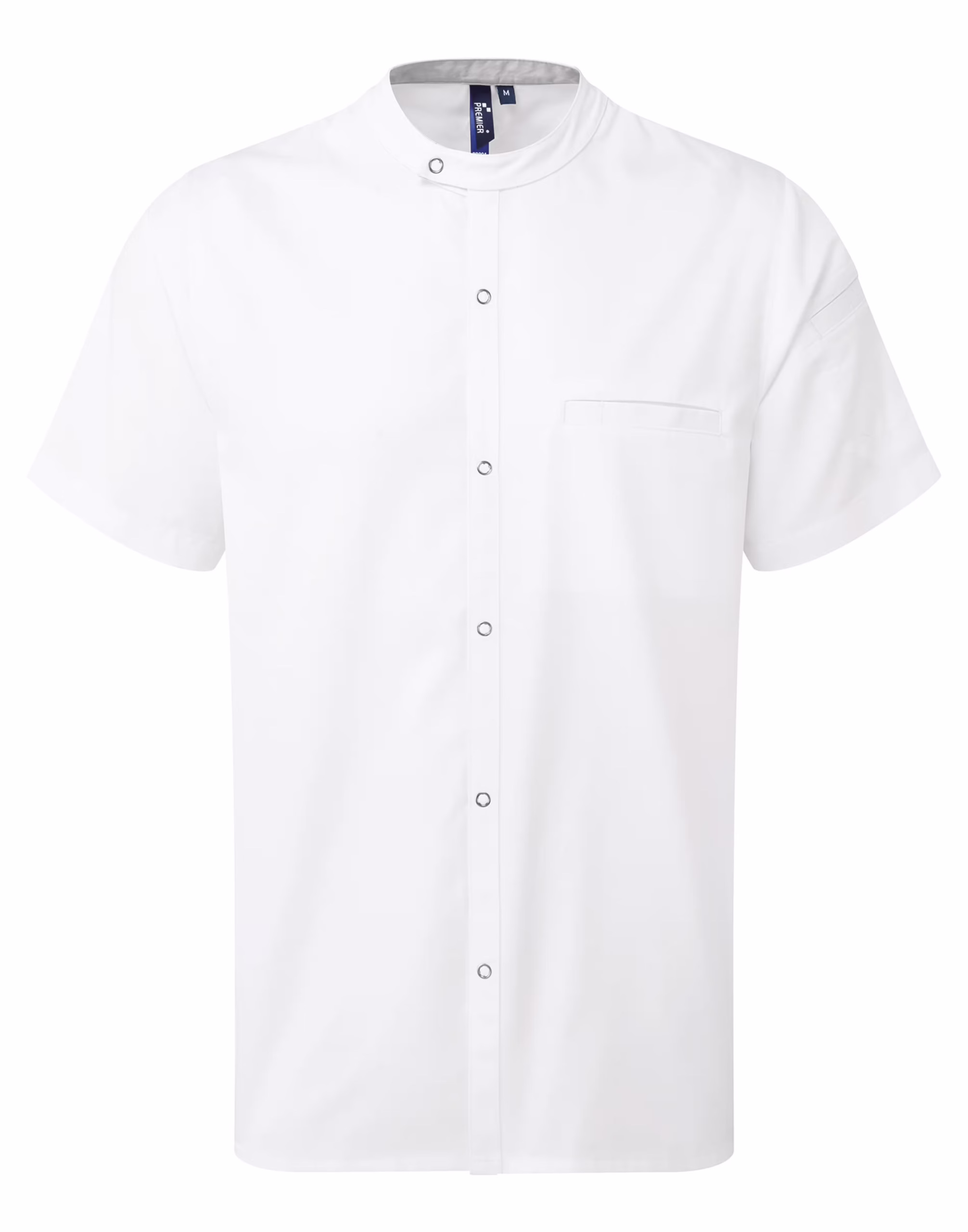 Jaleca de chef de manga curta, fabricada com 65% de poliéster reciclado e 35% de algodão, aliando conforto, durabilidade e uma escolha mais sustentável. Apresenta cinco molas de pressão na parte frontal para um fecho prático, gola à padre (colarinho mao) com mola de pressão e bolso no peito com compartimento para caneta, ideal para o dia a dia profissional.
