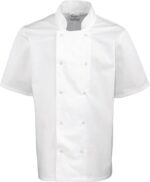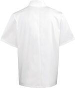 Jaleca de chef de manga curta, ideal para ambientes de cozinha exigentes. Confecionada em tecido aveludado, flexível, resistente e de tratamento fácil, é composta por 65% poliéster e 35% sarja de algodão, proporcionando um toque suave e elevado conforto. Inclui dez molas de pressão que facilitam o vestir e despir, gola à padre com pespontos e é adequada para lavagem industrial até 85 °C e lavagem doméstica até 60 °C.