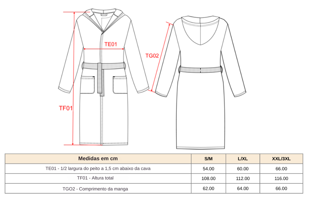 Roupão em Malha Terry. Toque suave e agradável de usar. Capuz grande. 2 bolsos laterais cosidos com pesponto de reforço na parte superior. Presilhas na cintura. Presilha para pendurar. Acabamento com costura dupla na borda do capuz, nas mangas e na bainha. Acabamento tubular na bainha e nas mangas.