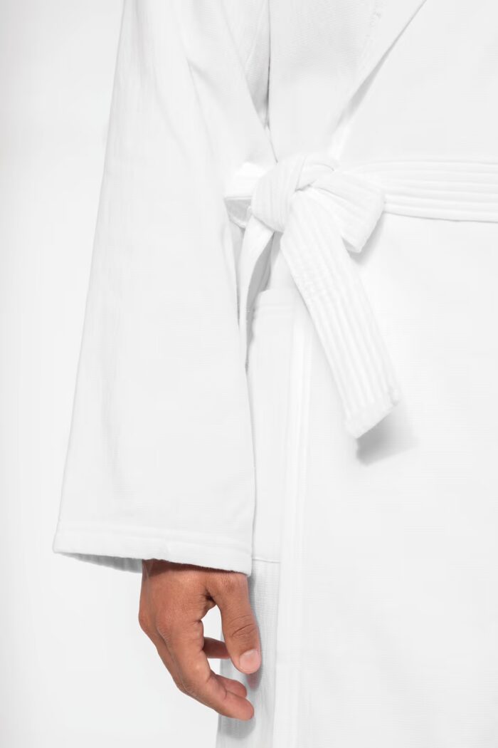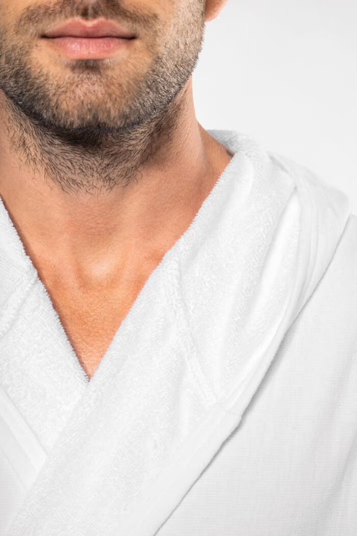 Roupão em Malha Terry. Toque suave e agradável de usar. Capuz grande. 2 bolsos laterais cosidos com pesponto de reforço na parte superior. Presilhas na cintura. Presilha para pendurar. Acabamento com costura dupla na borda do capuz, nas mangas e na bainha. Acabamento tubular na bainha e nas mangas.