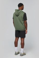 Sweatshirt unissexo sem mangas com capuz, confeccionada em algodão com interior cardado suave, garantindo um conforto ideal para o dia a dia.